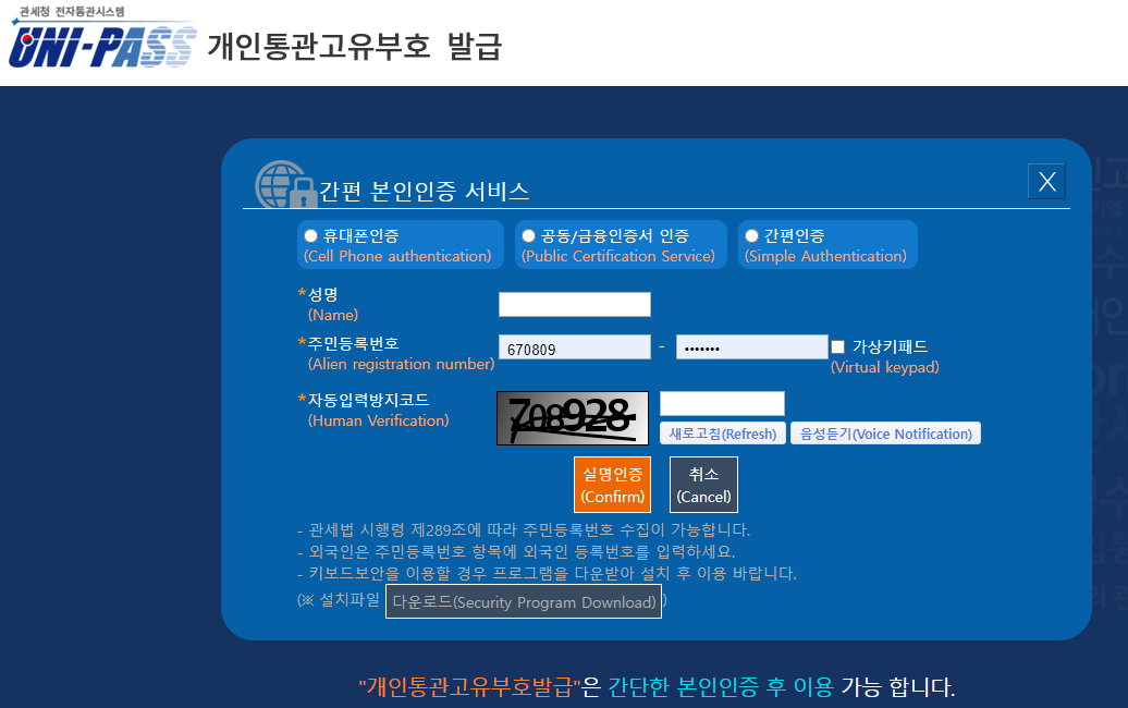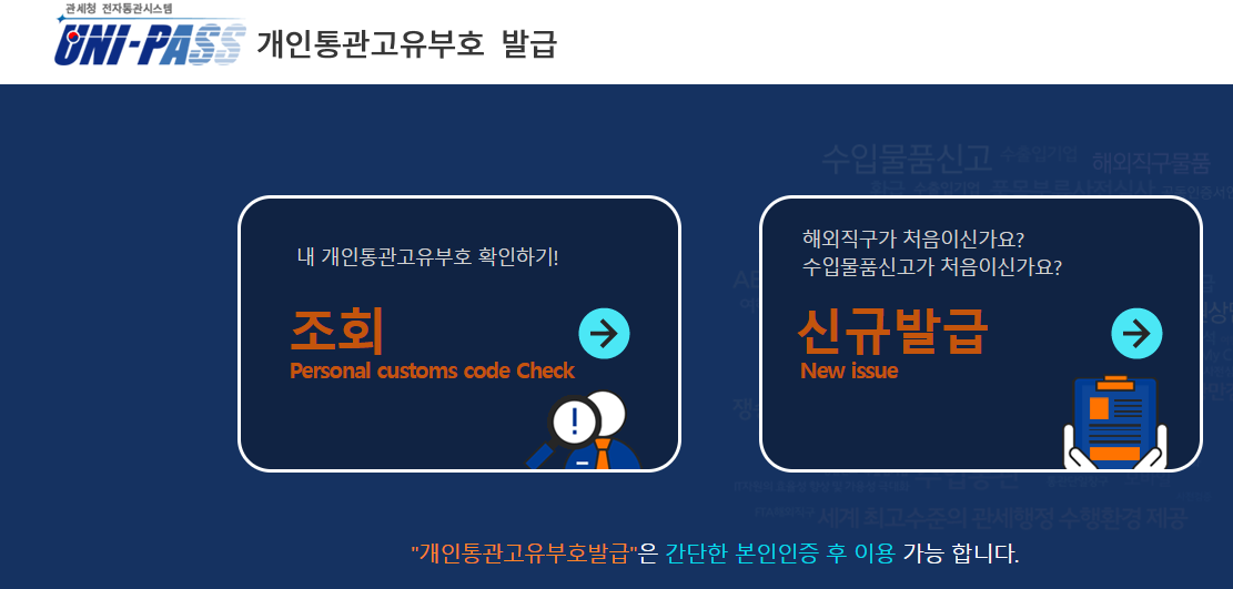 개인통관고유번호(개인통관고유부호) 발급은 간단한 본인인증 후 이용가능하며, 국가관세정보종합망에 접속하여 발급이 가능합니다.