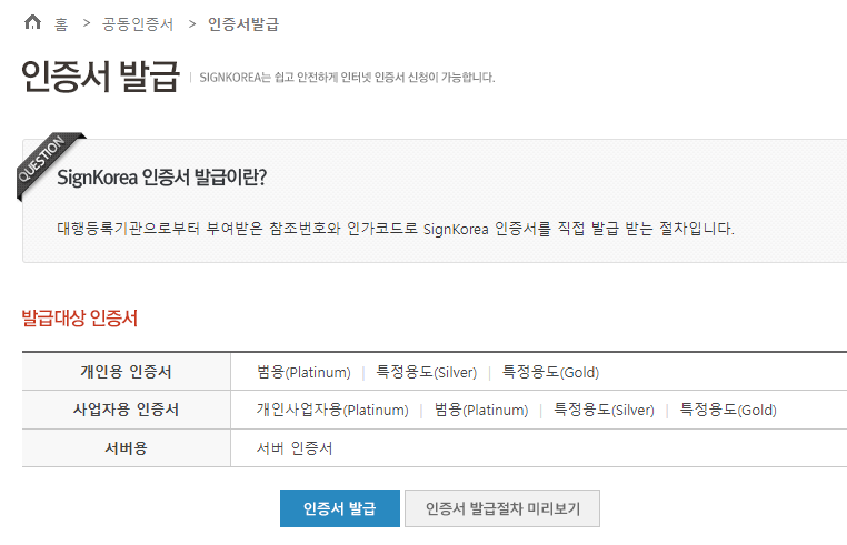 인증서 종류는 3가지로 분류되어 있습니다. 사업자용 인증서, 개인용 인증서, 서버용 인증서가 있습니다.