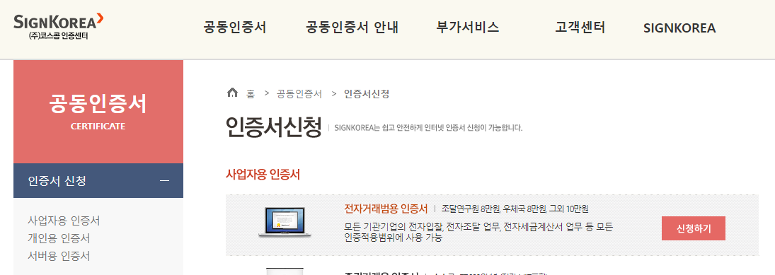 인증서 신청서는 (주)코스콤인증센터(SIGNKOREA)는 쉽고 안전하게 인터넷 인증서 신청이 가능합니다.