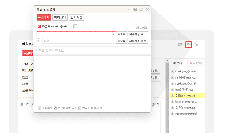 - 메일쓰기에서 우측 아이콘을 통해 간단쓰기가 가능합니다.