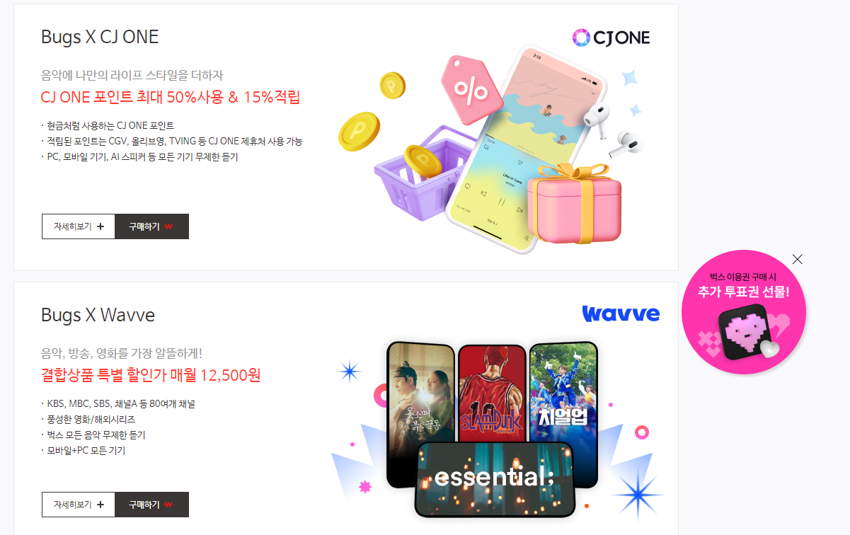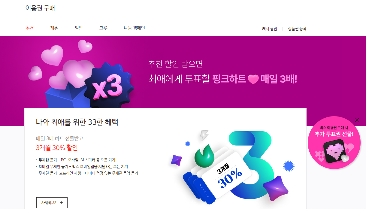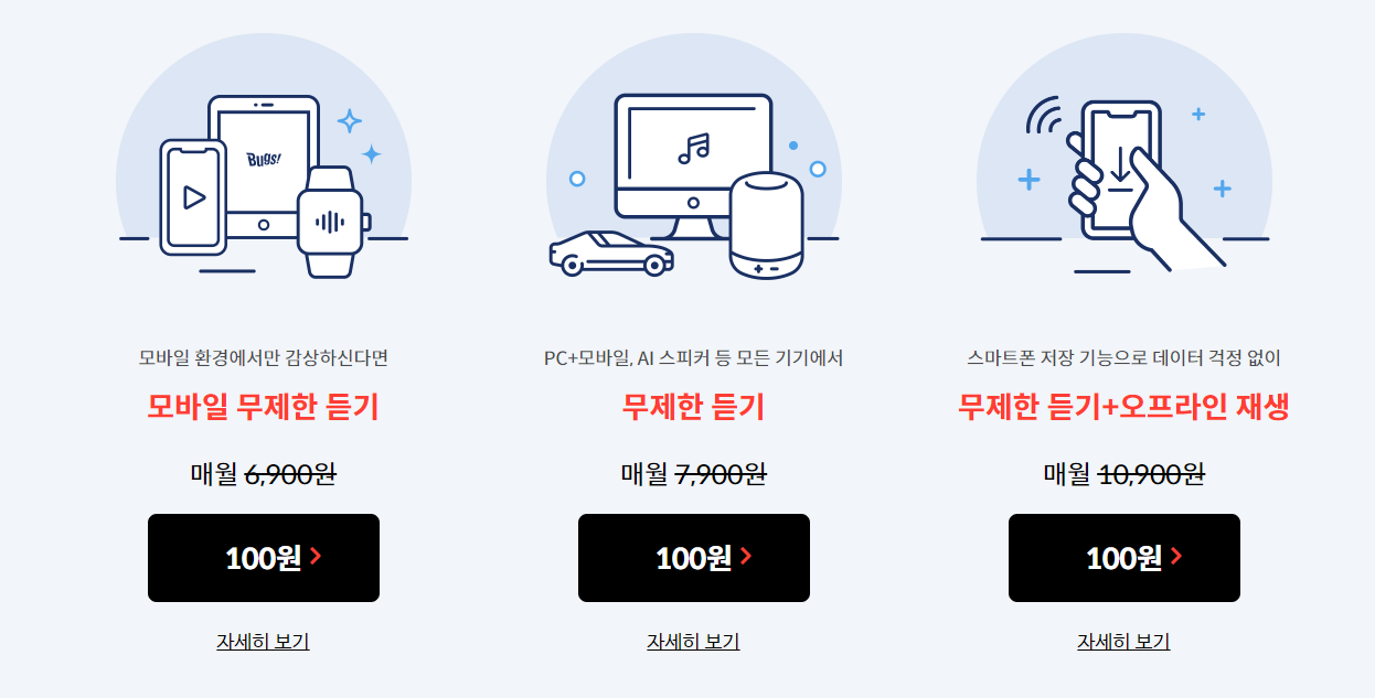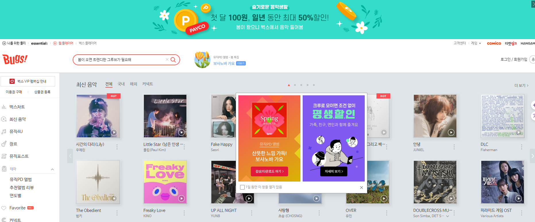 첫 달 100원, 일년동안 최대 50%할인 ! 봄이 왔으니 벅스에서 음악 들어보세요.