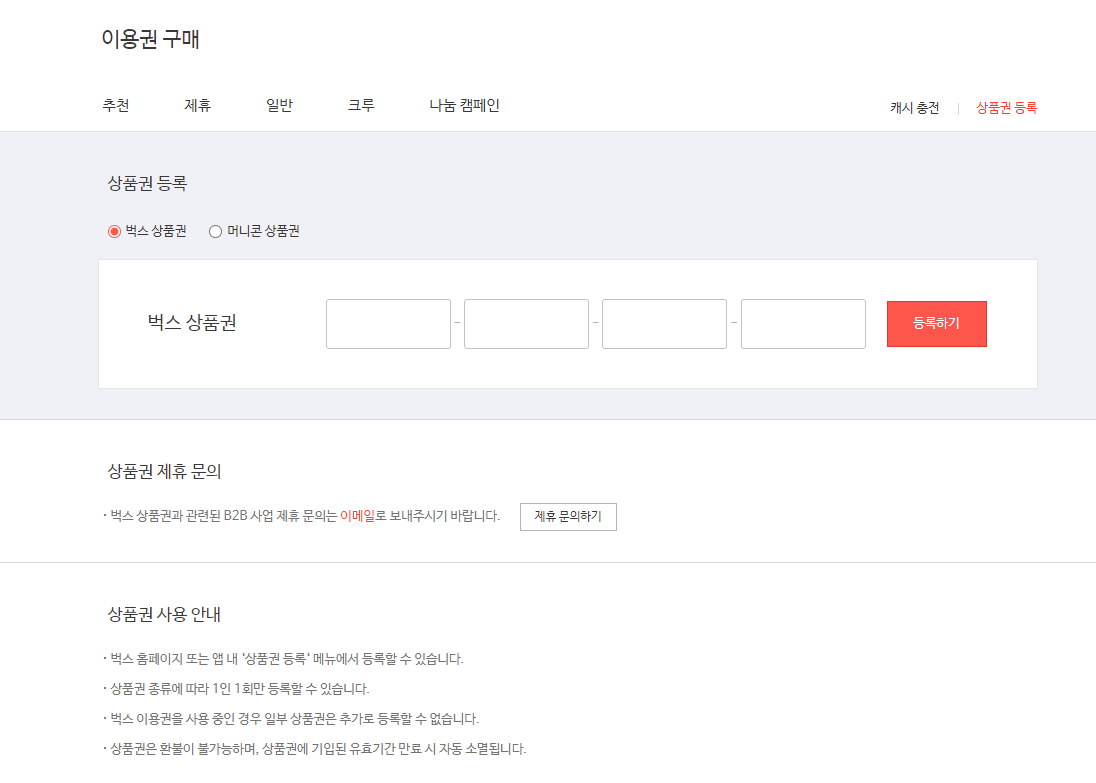 벅스 홈페이지 접속 이용권 구매 상품권 등록