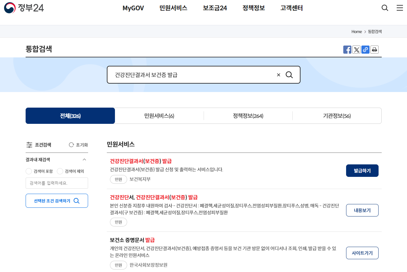 2. 민원서비스 건강진단결과서(구 보건증)검색하여 회원가입후 인증받고 발급받으면 됩니다.