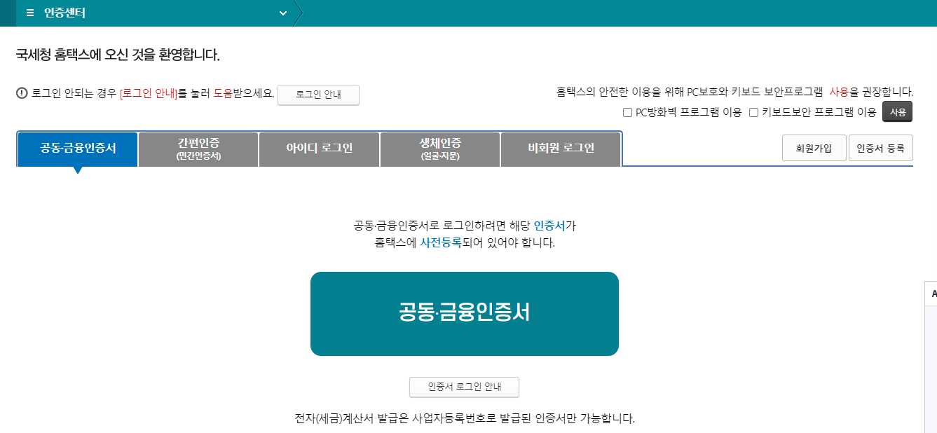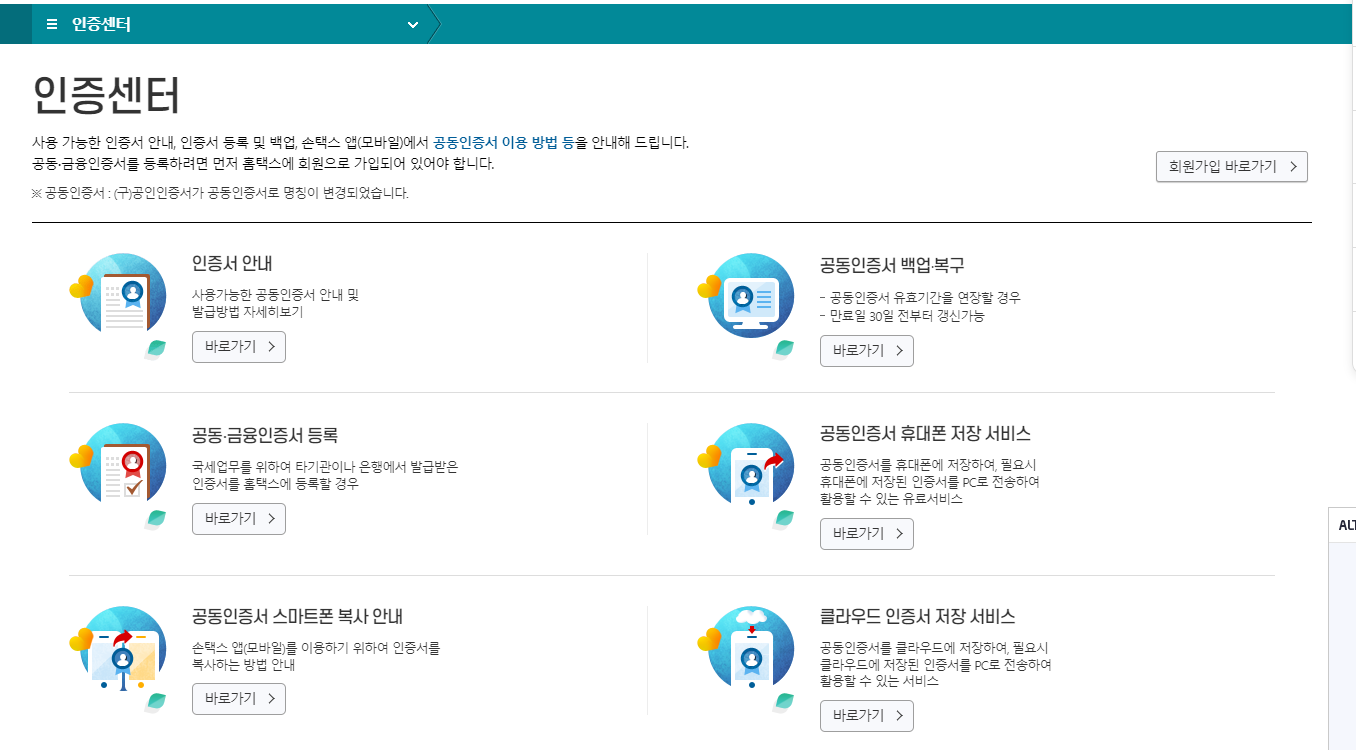 원천징수영수증 인터넷발급을 위해 국세청 홈택스에 접속하여 회원가입을 하고 개인인증서를 등록을 합니다.