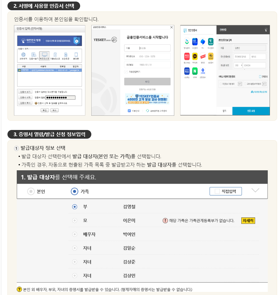 답변2 . 전자가족관계등록시스템 PC 및 모바일(또는 태블릿)에서 ①증명서 발급 메뉴 접속 → ②본인의 인증서로 본인확인 → ③증명서 발급 화면에서 수령방법을 ‘전자문서지갑’을 선택하여 발급을 신청합니다.