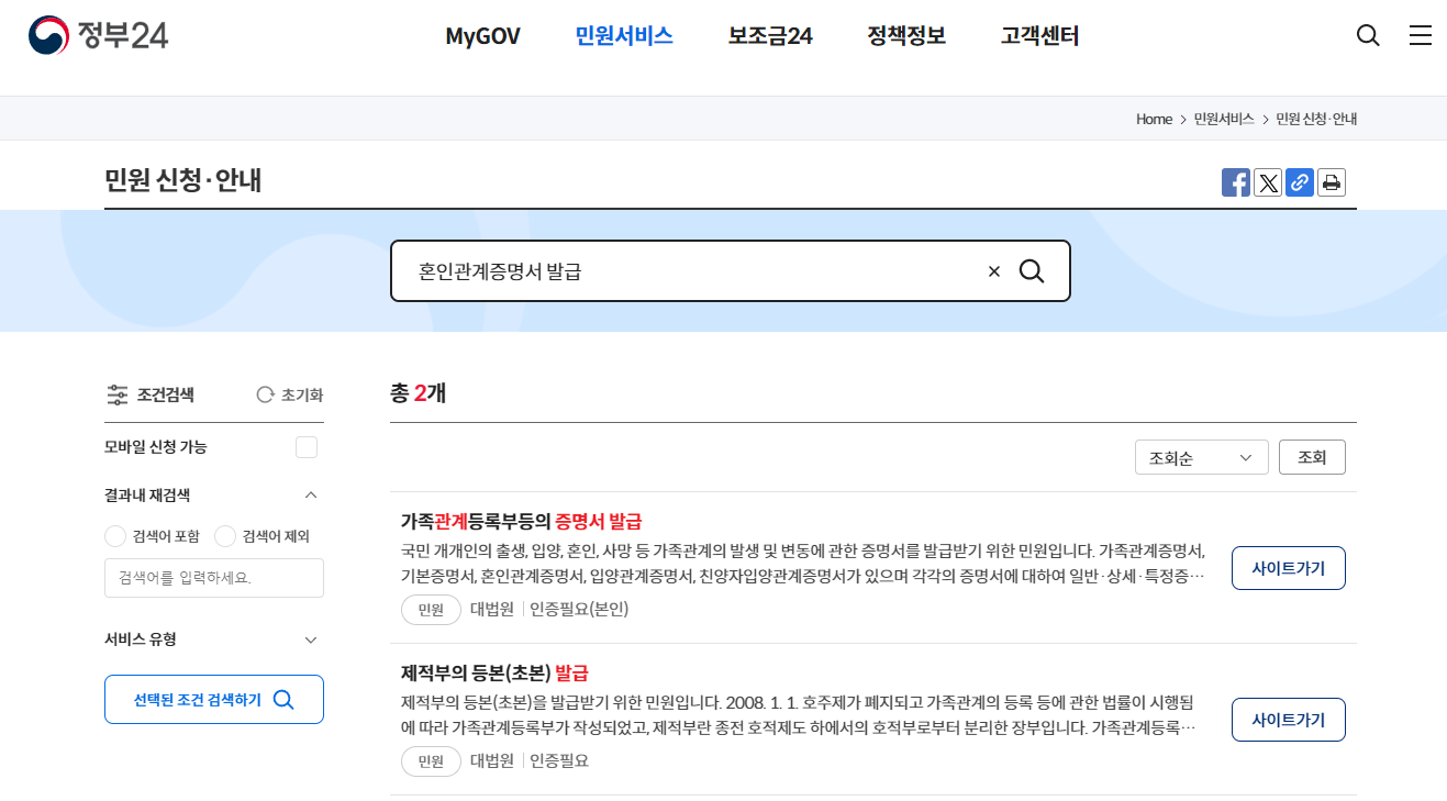 혼인관계증명서 인터넷발급 민원 신청안내/정부24