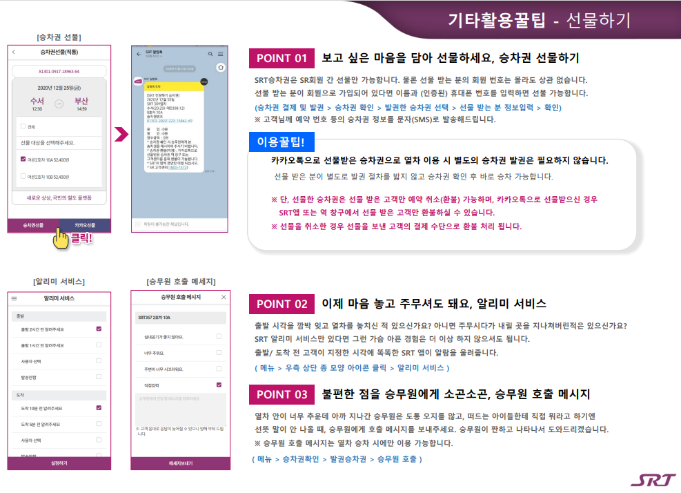 2. 승차권 확인 : 발권된 승차권과 예매내역, 이전 구매이력 조회, 승차권 반환 및 타 회원에게 승차권 선물 기능